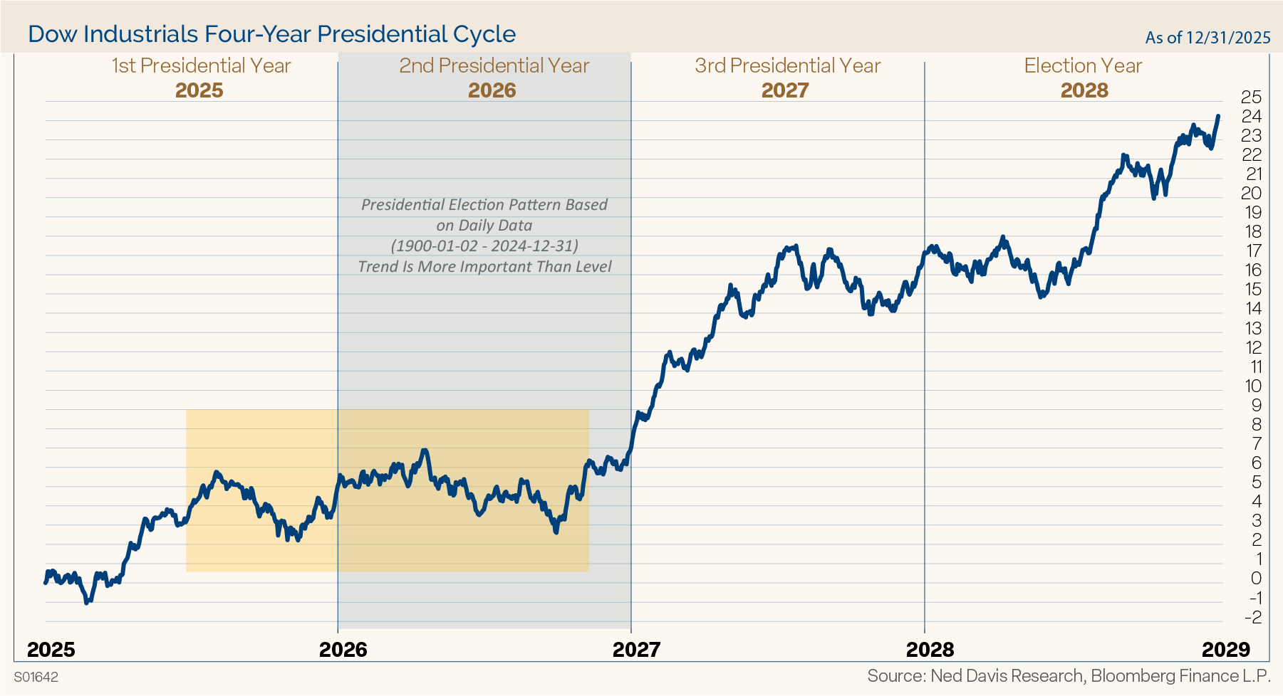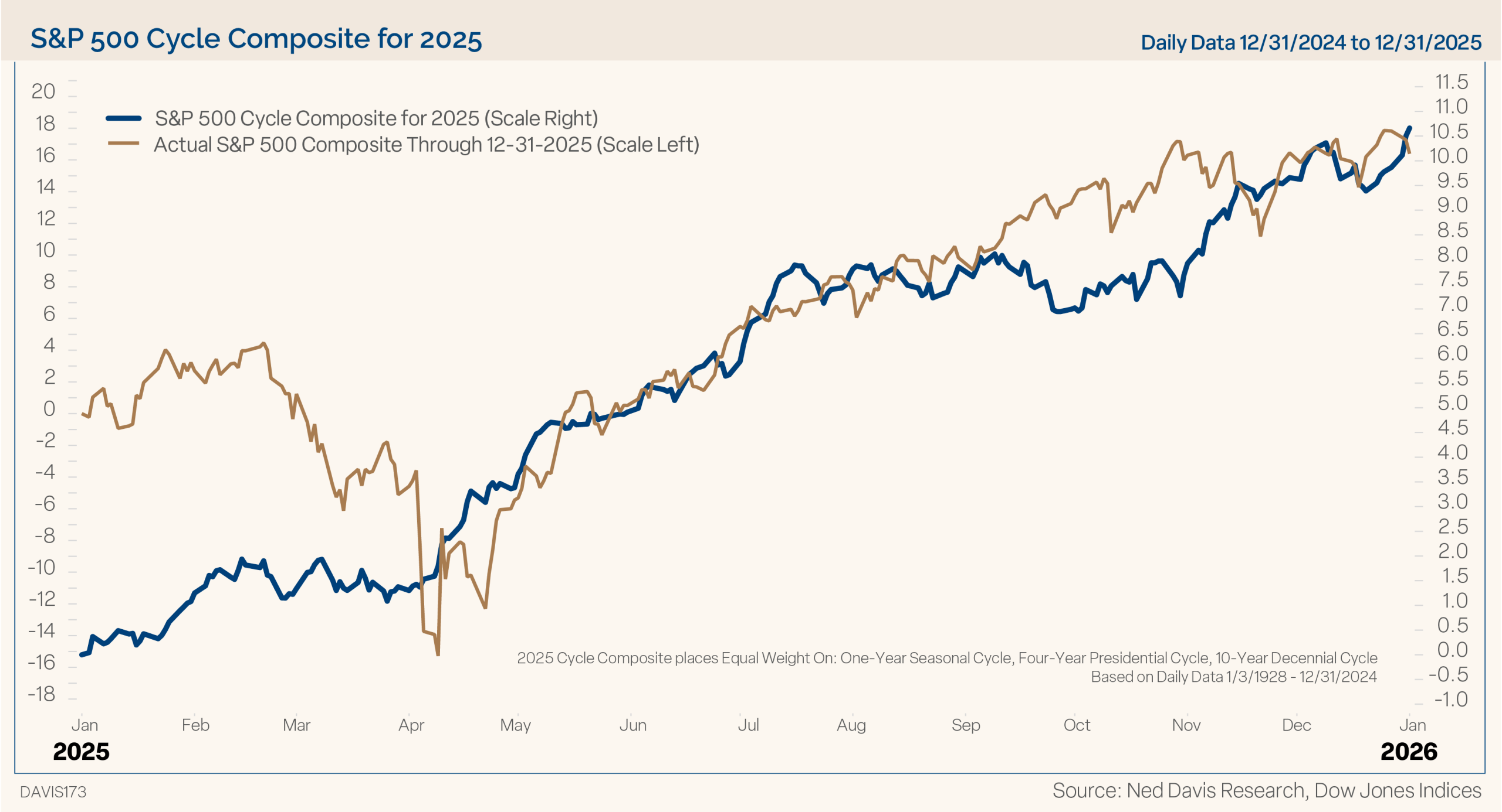 In last year’s outlook we said, “The Cycle Composite shows a strong first half, third quarter pullback, and year-end rally. Whether the second half of the year follows the more bullish Cycle Composite or the cautious four-year cycle may depend on inflation and EPS growth.” The market followed the composite well. The exception was that the tariff volatility was more extreme, but the rest of the year trended higher, driven by disinflation and strong earnings growth, as we suggested.