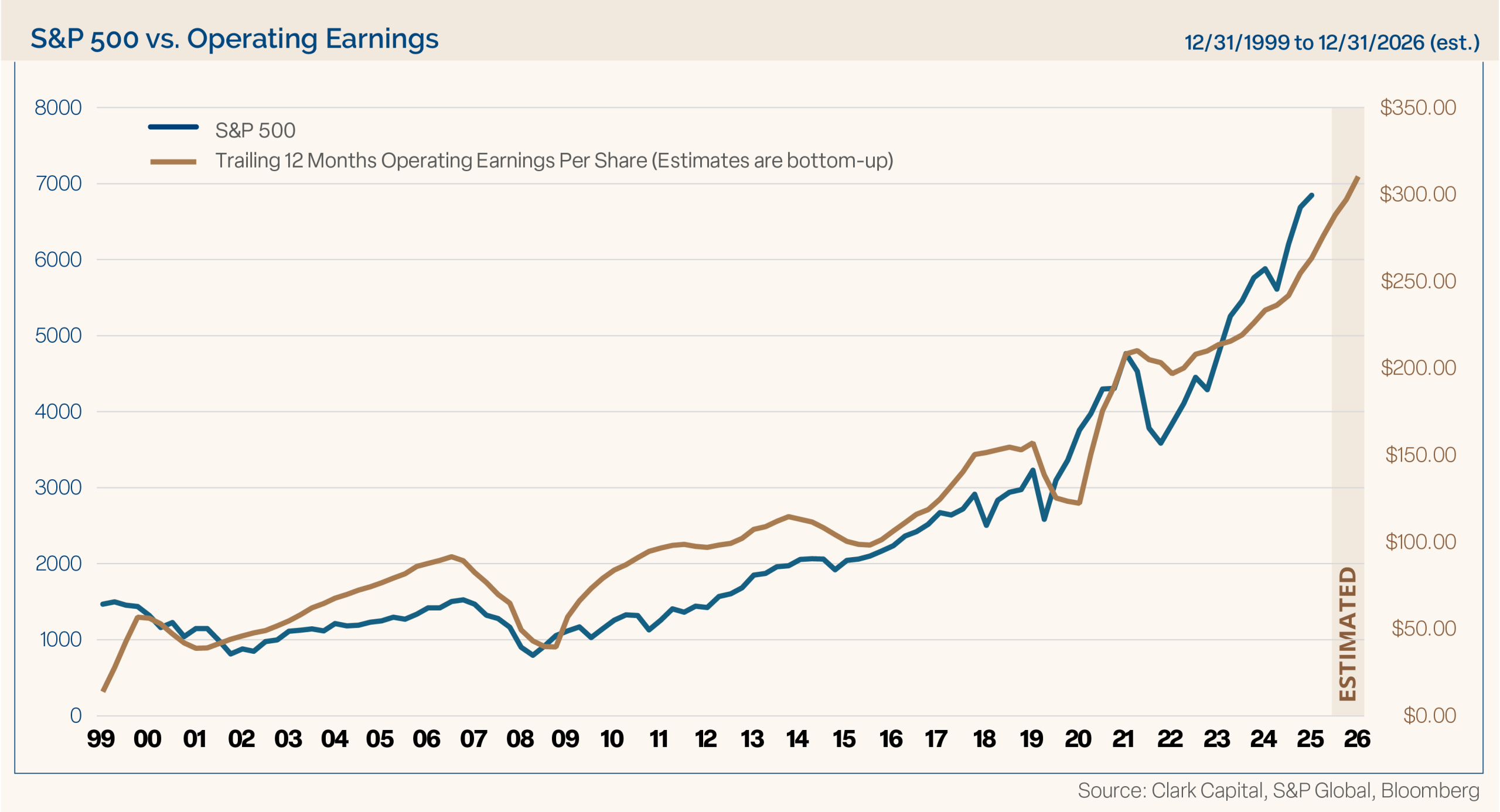 Given that valuations are at cycle highs, we don’t expect more multiple expansion. Therefore, earnings growth will be the primary driver of further gains for the market moving forward. Applying a forward P/E multiple of 22 to our expected S&P 500 earnings per share of $350 in 2027, implies a 7700 target at year end. That represents a 12.5% gain from where it closed 2025.