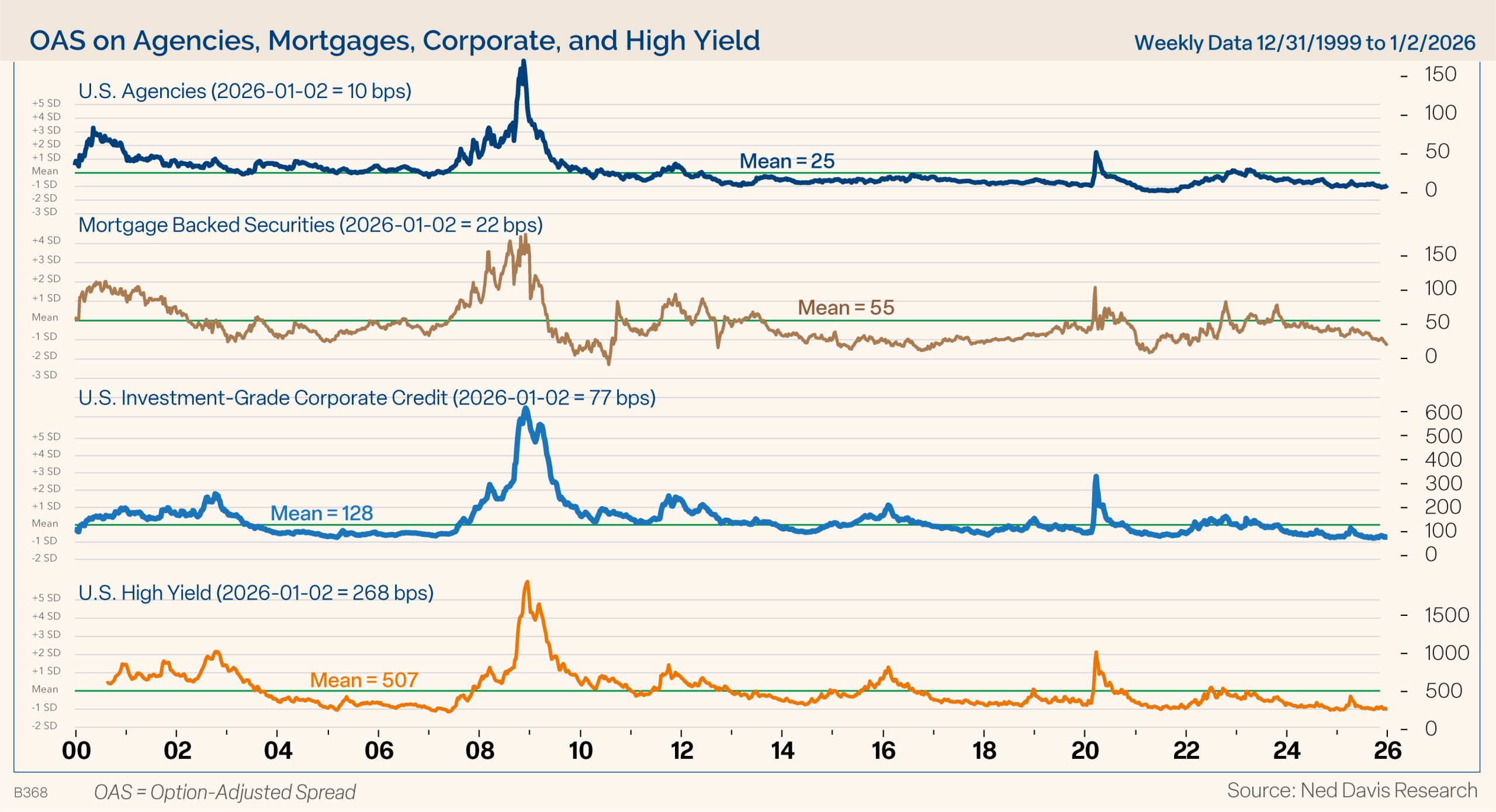 Turning to credit, there is no stress, financial conditions are easy, and abundant liquidity provides a supportive backdrop. The economy continues to surprise to the upside, and corporate America balance sheets are in solid position with record high profits. As such, our models continue to favor credit as the new year begins.