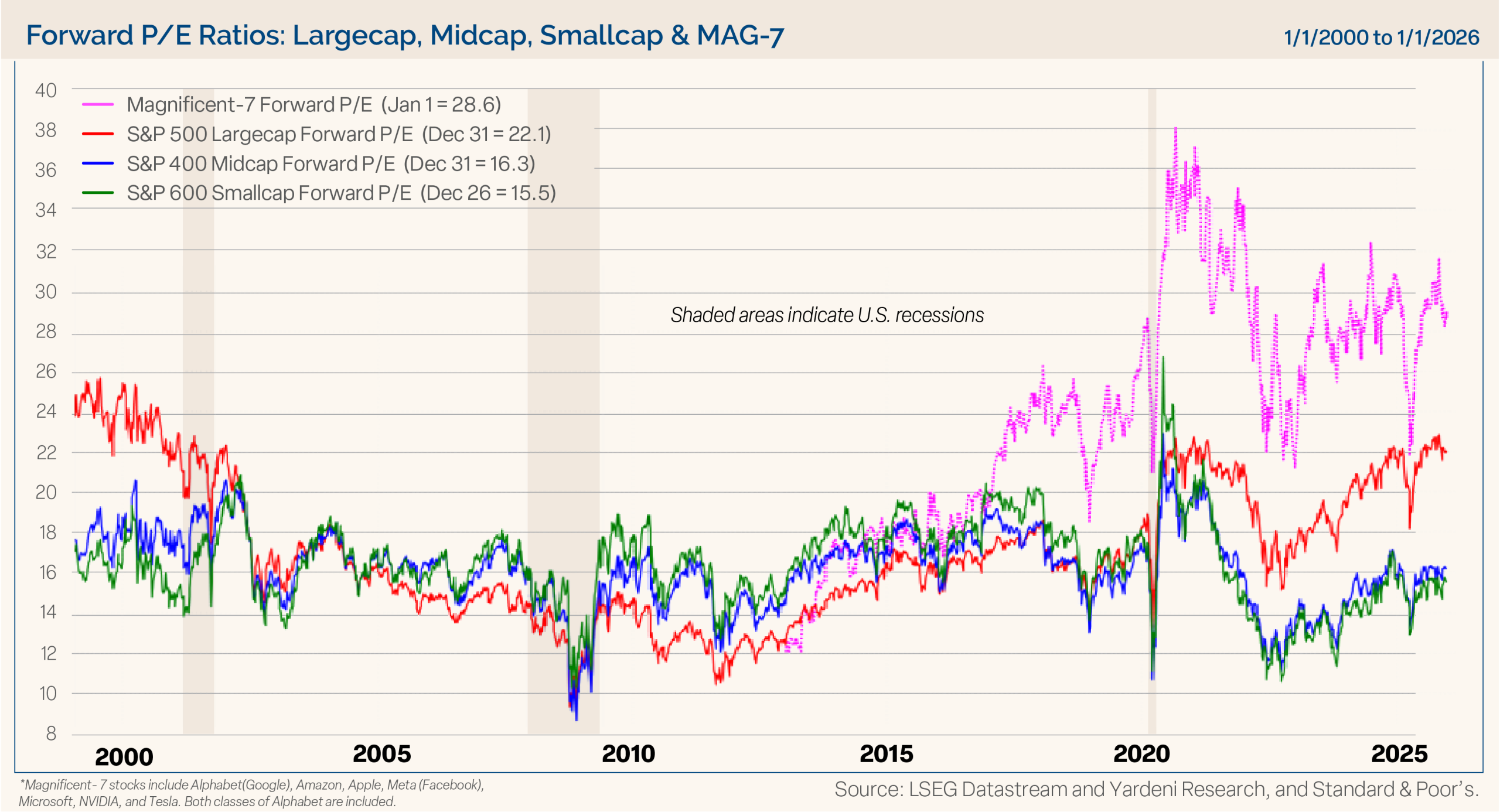 The valuation landscape is very nuanced. The market is expensive for large-cap stocks and much cheaper for mid- and small-cap stocks. As shown in Figure 10, the forward P/E of the Magnificent 7 is certainly down from its peak levels of the past several years, as earnings growth has outpaced stock prices. It’s even lower than in early 2025, but it still trades at 28 times next year’s earnings. The S&P 500 forward P/E is 22.1, trading at the high end of its recent range and right where it was at the beginning of last year. We know valuations are a very poor timing tool, as the market can stay rich for extended periods, but they do tell us that risks are elevated if earnings growth doesn’t materialize.