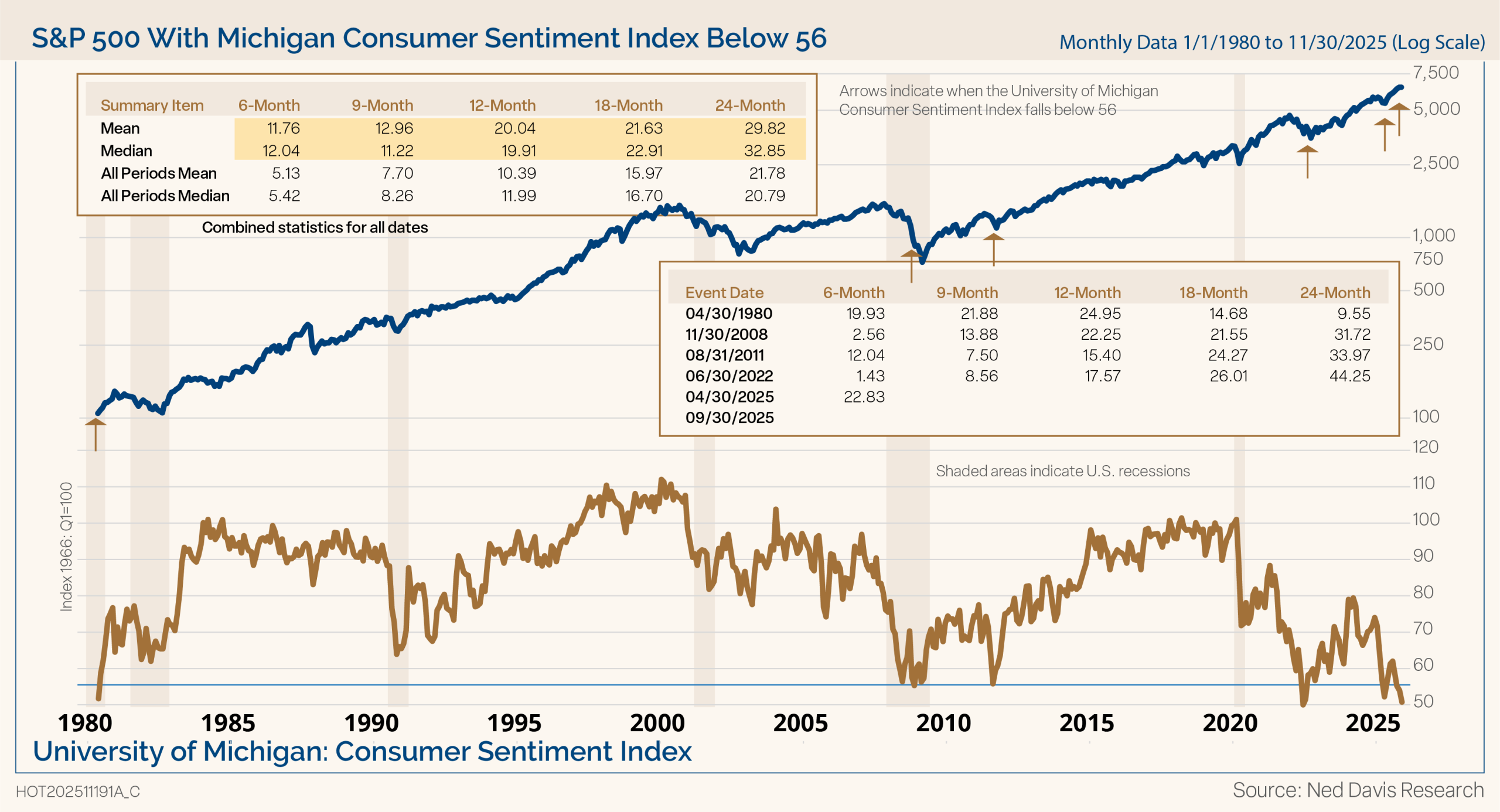 Another measure of crowd psychology is shown in Figure 8 is the University of Michigan Consumer Sentiment Index, which measures American consumers’ confidence in the overall economy and their personal finances, reflecting their feelings about current conditions, future economic growth, and their likelihood to spend. Consumers are overwhelmingly pessimistic, likely a function of the political climate and biases and a reflection of the K-shaped economy. Nonetheless, the market has been positive, and has posted above average returns six, nine, 12, 18, and 24 months later when consumer sentiment has been this low.