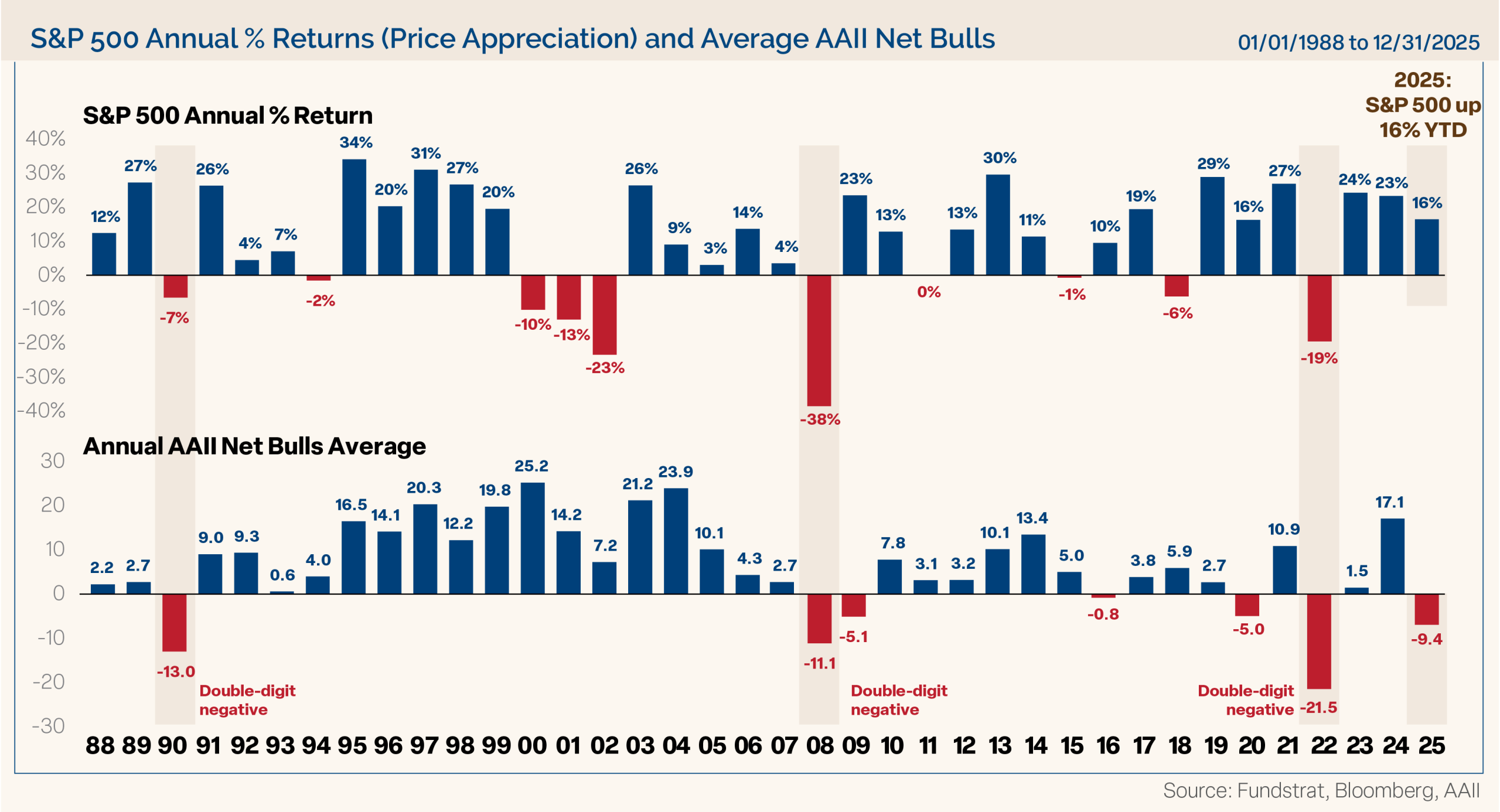 Let’s look at investor sentiment. For the stock market, fundamentals matter over the long run, however, in the short run, sentiment is also important. We know that markets climb a “wall of worry,” and there was no shortage of worry in 2025.
