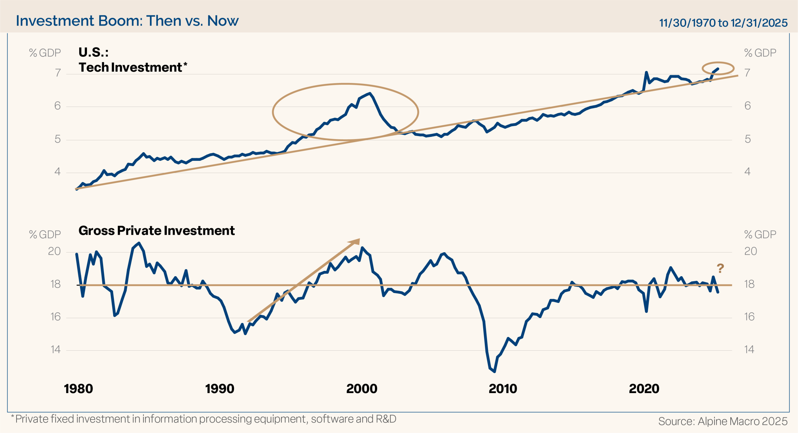 A hot topic of debate is whether we are in an AI bubble, like the tech bubble in the late 90s. Our take is no. Instead, there is a bubble of bubble talk. Shown in Figure 12, today’s technology investment is closer to trend spending growth than it was during the tech bubble, and private investment as a percentage of GDP is nowhere near the bubble territory of the late 90s. In addition, the technology companies leading the charge on AI are massively profitable and show no sign of deteriorating.