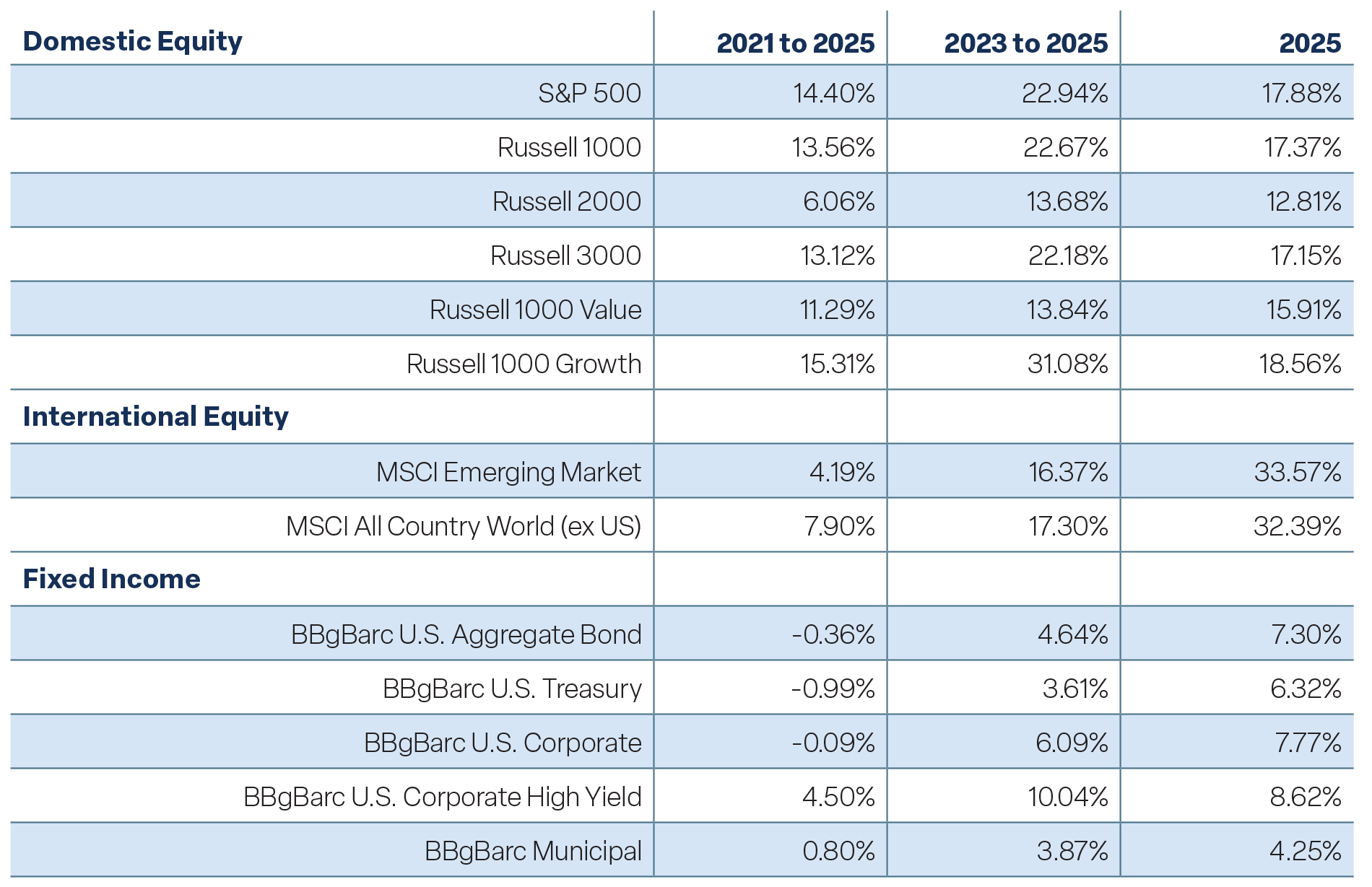 Staying with valuations, international markets are trading at a steep discount to the U.S. The MSCI ACWI ex-U.S. Index forward P/E is 30% less than that of the S&P 500, not surprising given that in 12 out of the past 15 years, the S&P 500 outperformed the broad international index. Last year’s advantage went to international stocks, with most of the outperformance occurring during the tariff volatility. Nonetheless, given the valuation difference and weaker U.S. dollar, we think developed and emerging international markets may be primed for more outperformance.